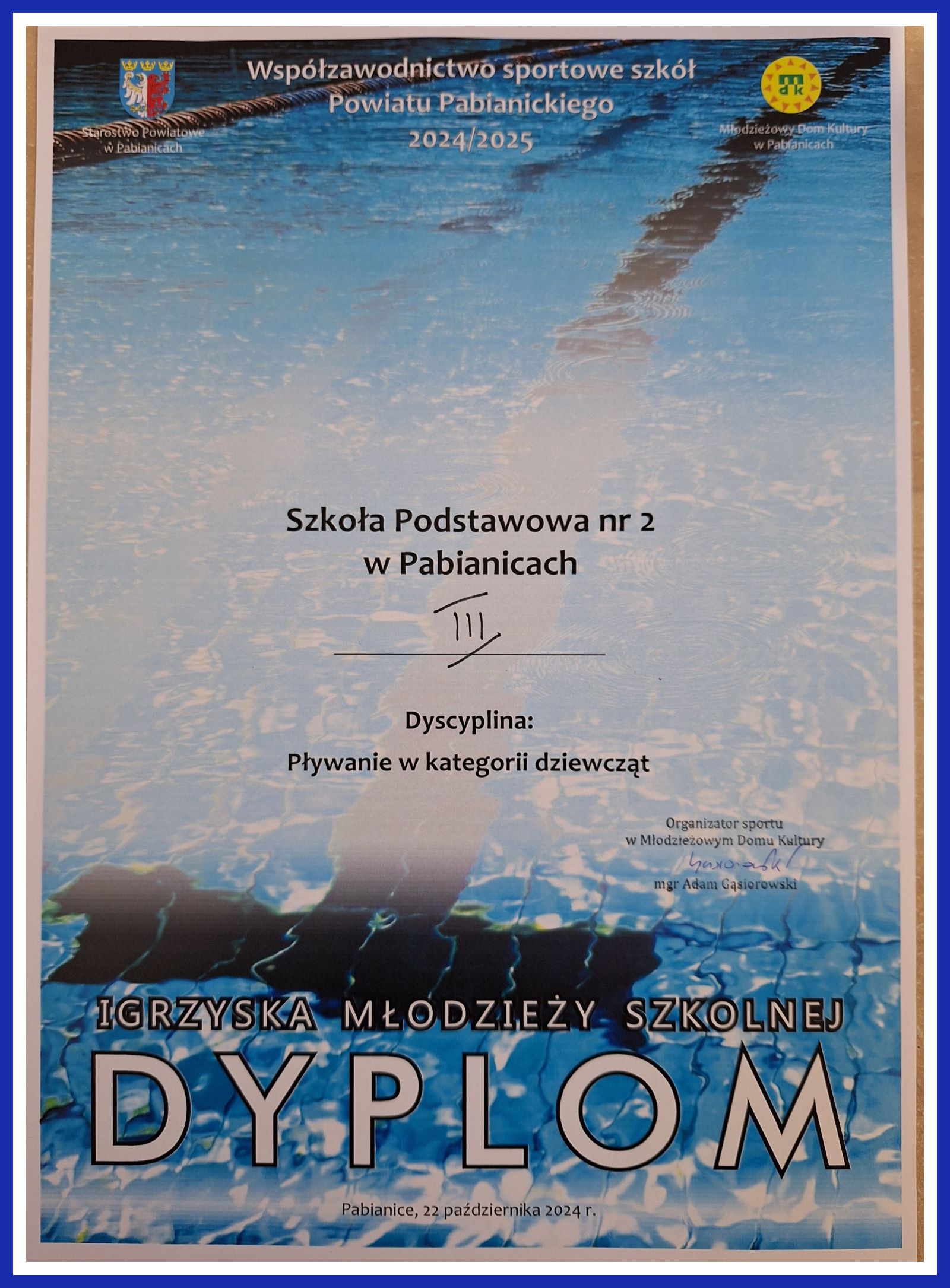 W dniu 22.10.2024 r. uczennice z klas 7 - 8 reprezentowały naszą szkołę w Powiatowych Igrzyskach Młodzieży Szkolnej w pływaniu.
